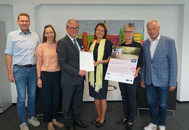 Bildinformation: Bei der Übergabe des Förderbescheids waren (v. l.) Stefan Buschmeier, Sachgebietsleiter im Amt für Umweltschutz und Grünflächen, EKS-Programmleiterin Brigitte Zacharias, Bürgermeister Michael Dreier, Regierungspräsidentin Anna Katharina Bölling, die Technische Beigeordnete Claudia Warnecke sowie der stellvertretende Bürgermeister Dieter Honervogt anwesend.