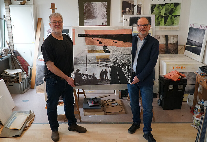 Bildinformation: Künstler Wolfgang Brenner (links) und EKS-Programmleiter Dr. Michael Ströhmer zeigen die Collage-Arbeit unter dem Titel „Wasser fließt“.